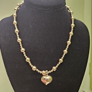Elegant necklace with a gold heart pendant. Features a beaded chain. Perfect for any occasion.