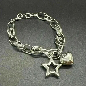 Y2k inspired fashion heart and star link bracelet. Adjustable clasp grunge bracelet. 2000's silver tone Aesthetic Jewelry. 🖤