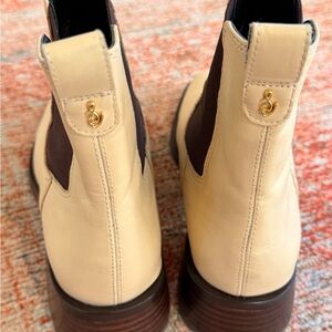Stylish cream Chelsea boots with black elastic panels. Ideal for versatile wear.
