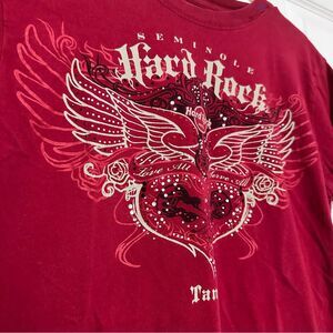 Embrace a bold look with this vibrant red Hard Rock Cafe t-shirt, featuring a fitted design and short sleeves. The striking white winged emblem on the chest adds a touch of classic rock flair, making it a standout piece in any casual wardrobe. Tampa hard rock, 100% cotton