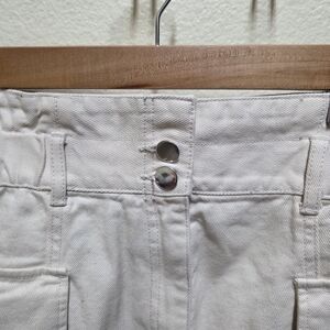 Chic cream skirt with high waist. Features button detail and usable large pockets. I'm 5'2, 120 lbs, and this fits good. The waist band has lots of stretch. The length ends right above my knees. Only worn a few times, like new.