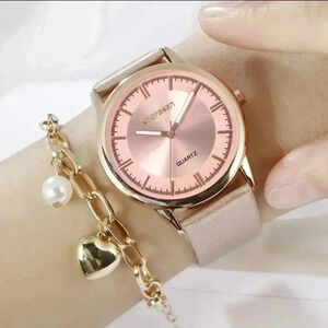 1pc Golden Leather Strap Quartz Watch +1pc Faux Pearl Heart Love Alloy Bracelet ..NWT..we bundle..enjoy