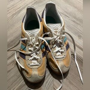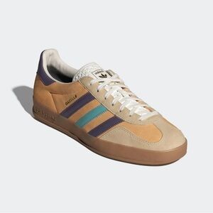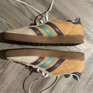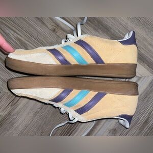 adidas Gazelle indoor shoe in colors glow orange, shadow violet, off white . Size men’s 7 1/2. Fit my women’s size 9 foot