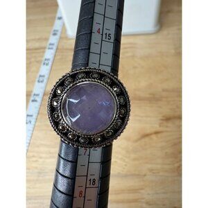 This elegant sterling silver ring features a round amethyst center stone surrounded by marcasite accents. The adjustable band ensures a comfortable fit.