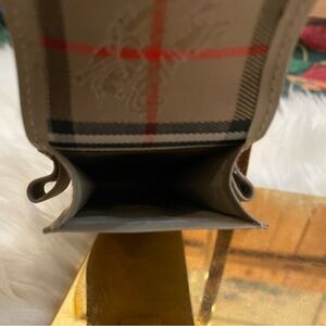 Stylish Burberry phone sleeve in tan leather. Features signature check detail. Please review all photos for details and conditions regarding flaws/smudges on closure, it won’t show when close properly and bottom has creases as all photos are part of descriptions before bidding or purchasing. Preloved.