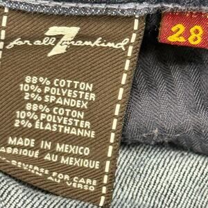 The product is a pair of 7 For All Mankind Bootcut Jeans in a dark wash with rhinestone pocket detailing. These jeans feature a low rise, bootcut style, and are made of a polyester blend with added stretch and cotton blend for comfort. The dark wash and rhinestone accents give them a stylish and trendy look, perfect for all seasons. The jeans are designed for a regular fit and come in a size 28 with a 30-inch inseam. Made in Mexico, they are machine washable and ideal for a fashionable and versatile addition to any woman's wardrobe.