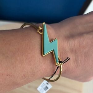Stylish bracelet with a turquoise lightning bolt charm. Gold-tone band. Perfect for adding a pop of color.