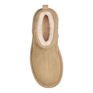 Pull tab at heel; the UGG® logo, embossed suede heel label; decorative stitching