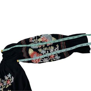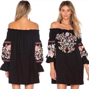 Embrace your inner flower child with this Free People Fleur Du Jour black mini dress. Perfectly peasant-style with a modern twist, it features a flexible elastic neckline that can be worn on or off the shoulder, making it versatile for any occasion. Its balloon peasant sleeves with elastic ruffled bell cuffs add a touch of whimsical flair, while hidden side seam pockets blend functionality with fashion. The shift silhouette offers an effortless fit, making it a fabulous choice to wear as a long tunic over leggings or skinny pants. This dress is unlined, crafted from 100% cotton, and beautifully adorned with light blue, light green, and coral floral embroidery.