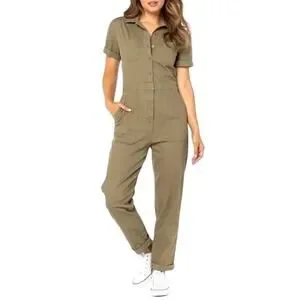 Re:Generation by Celebrity Pink olive green utility jumpsuit designed in a classic one-piece workwear silhouette with straight-leg jogger styling. Jumpsuit features functional chest pockets, a gently cinched waist for shape, and a contrast collar. The uniform green tone/structured design align with utility, gorpcore, minimalist, military-inspired, and Y2K workwear aesthetics, making it an easy everyday statement piece styled with sneakers or boots.