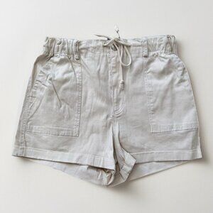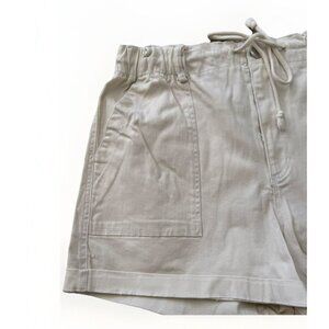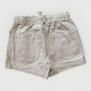 These are women's size large beige shorts made from a cotton blend fabric. The shorts have a paperbag style with a high-rise waist. They feature a zip, button, and drawstring closure. The design is solid in color, suitable for casual occasions.