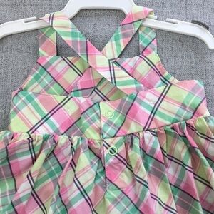 Pink and green plaid sleeveless summer dress with embroidered owl at hem and velcro hat (1st pictured left to right), 6mo, criss cross back with closure buttons