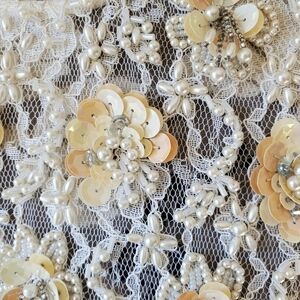 Stunning dress that is ivory lace and completely adorned with beads and sequins forming flowers that have amazing dimension! This dress is quite heavy with all of the beading and you'll need something underneath as it is see through lace.