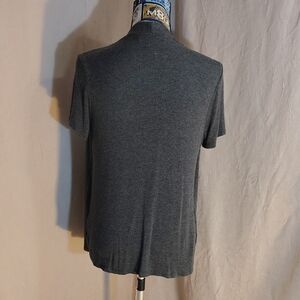 Stylish gray open-front short sleeve cardigan. Paired with a white knit top. Perfect for layering. Measurements Bust 17" length of shell 27" white top length 21".