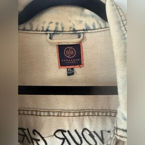 Cream denim jacket with bold pop art graphic. Features vibrant colors and unique style.