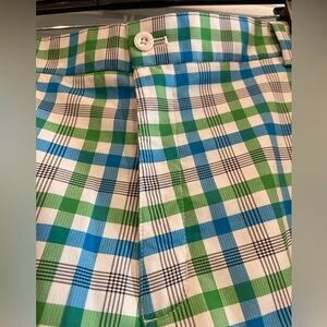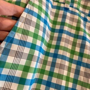 Spice up your game with these men's comfortable shorts featuring a vibrant blue and green plaid pattern, all day moisture management, button fly closure, belt loops, two front and two back pockets in excellent condition.