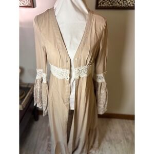 Venus Women's US 2 Boho Bell Sleeve Crochet Trim Maxi Cardigan Duster Sand Tan