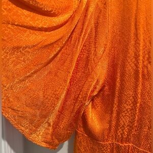 This orange shorts romper is too fun! Worn once in Nashville, this look is very versatile! Twisted along an ab-baring O-ring cut-out, the romper flows along voluminous short sleeves. Back neck latch and zip closures. Size 18.