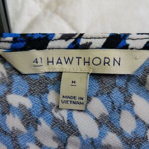 This is an elegant v-neck wrap shirt from 41 Hawthorn. The pattern looks like little flower petals over a blue background. The style is a faux wrap with a black elastic band across the side which give both flexibility and adjustability. This piece is in excellent pre-owned condition.