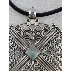 Large silver ethno medallion focal pendant on a black leather 18" cord. The medallion is a metal allow in done in silver tone, with a curled metal design. Could go with several themes: Indie, Celtic, tribal, etc. The medallion is 2.25" wide and 3" tall and is easily removable from the leather cord.
