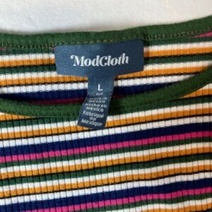 This ModCloth women’s dress is a vibrant piece perfect for any wardrobe. Featuring eye-catching multicolor stripes, a flattering scoop neck, and a belted waist for added style. Lightweight and sleeveless, it’s great for casual or dressy occasions.