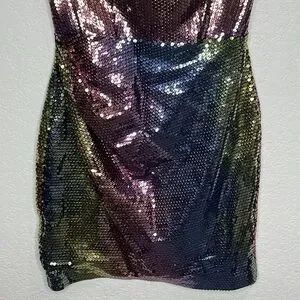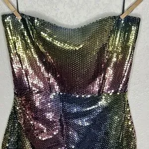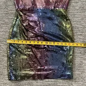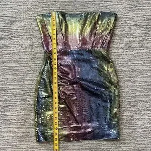 sequin-embellished mini dress from NEW ARRIVALS featuring sequin design, fitted waistline, draped detailing, rear zip fastening, above-knee length, strapless and green/blue/pink.