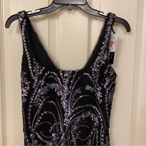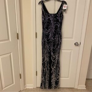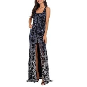 Betsy & Adam Sequined Square Neck Sleeveless Split Hem Gown in Navy/Silver