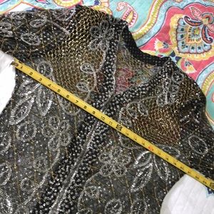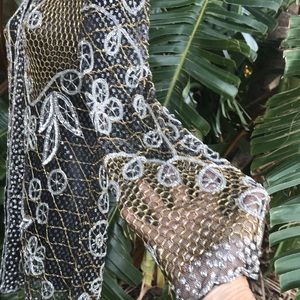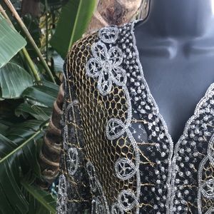 This jacket is just amazing it is a sheer mesh fabric that has been beaded with silver glass beads and gold net glass beads sequins and tiny seed pearl encrusted. Combination of silver and gold and black the scalloped edges are triple beadedAnd centered with seed pearls. There are some small shoulder pads giving it a 90s vibe.Just a fabulous vintage piece not a size tag in sight so please see measurement photos.And while you were looking look very closely at that exquisite beadwork. This is going to be beautiful over anything maybe you have a nice bra it or nothing at all.An exquisite statement piece for all seasons