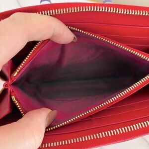 This wallet does show signs of wear around the corners, interior has coin residue in zipper pocket, and the original zipper pull has been replaced. See all photos.