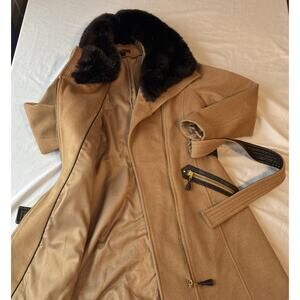 The VIA SPIGA Women's Asymmetric Faux-Fur-Collar Wrap Coat in size 6 is a stylish and versatile outerwear option for the winter season. Made from wool with a faux fur lining, this coat features a solid camel color with a zip closure and long sleeves. The asymmetry in the design adds a modern touch, while the faux fur collar and accents give it a luxurious feel. Ideal for various occasions including travel, parties, casual outings, and business meetings, this coat by Via Spiga is a chic choice for women looking for a fashionable and functional winter coat.
