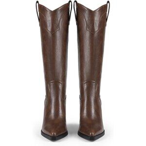 Women's Western Knee High Cowgirl Boots Pointed Toe Chunky Heel Leather Brown2