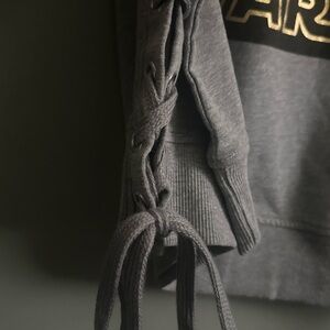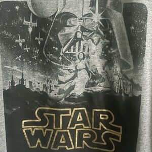 Stylish gray top with iconic Star Wars design. Features a striking gold graphic. Approximate measurements pit to pit 21, length 25
