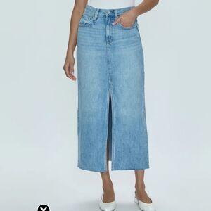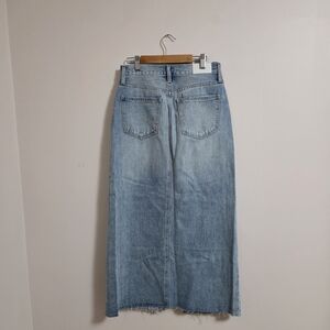 Chic denim maxi skirt with front slit. Light blue wash. Perfect for casual outings.