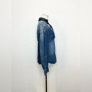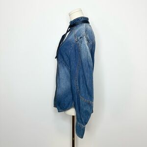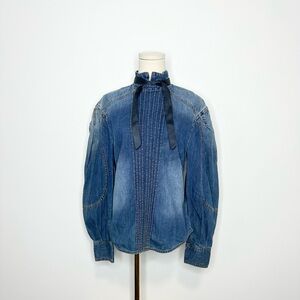 This collection sees Zimmermann’s signature florals and romantic silhouettes sharpened in the wake of current events. Abstracted digital floral prints, structured ballet-inspired silhouettes, and edgy finishes offer a punk-inspired take on the Australian brand’s feminine aesthetic. Flaunting blouson sleeves with buttoned cuffs, this tuxedo shirt is detailed with pin-stitching down the center with a removable necktie.