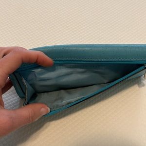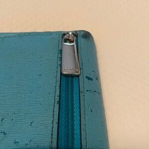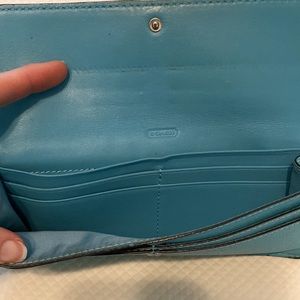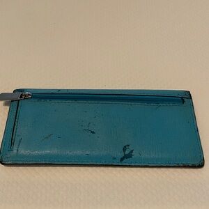 Coach turquoise or Robin’s egg blue wallet with 8 slots for credit cards, 2 interior sections and outer silver zippered pocket for coins. Still fully functioning with lots of life left. Excellent piece for those who like to clean and rehab vintage Coach.