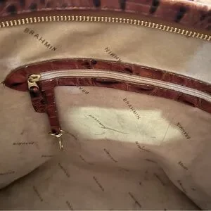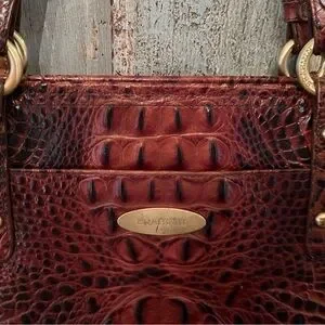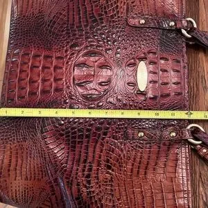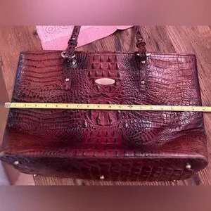 Roomy crocodile-embossed Brahmin tote in a deep burgundy hue. Large and sturdy-combines elegance and functionality. Used with some wear on bottom edge, some pen markings in interior. All zippers intact and work well, interior has several pockets, pen holders and key clip. Brass logo has some scratches on it. Very sturdy…used but lots of life left in it! Approximately 18” X 12”