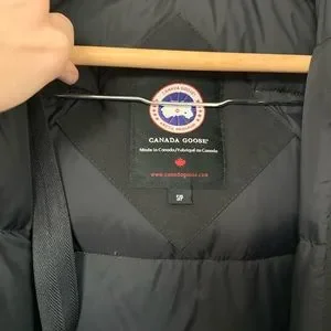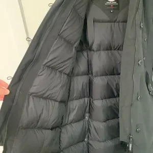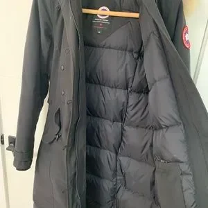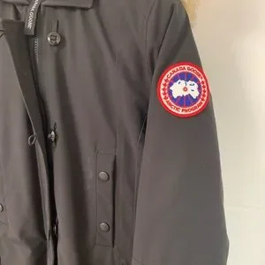 Stylish black parka with fur trim. Features button and zip closure. Iconic Canada Goose logo on sleeve.