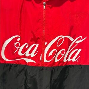 Classic Coca-Cola branded windbreaker with bold red and black colorblock design and iconic white script logo across chest. Features half-zip front closure, adjustable drawstring hood, repeating Coca-Cola logo tape down sleeves, elastic hem, and lightweight polyester construction. Cropped silhouette perfect for athleisure, casual wear, or vintage-inspired streetwear. Retro style that pairs with joggers, jeans, or leggings.