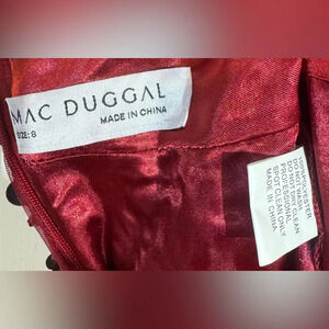 Charm your way into the crowd with this elegant dress designed by Mac Duggal 67854. The dress is made of lace and has 3D designs on it. The mesh skirt of the dress is multi-layered, forming a voluminous A-line silhouette. The bodice is tight with a V-neckline and loose illusion sleeves. The midi-length dress ends with a thick and opaque horsehair hemline.