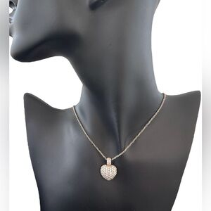 Large heart-shaped pendant made from 925 Sterling silver. The front of the heart is particularly elaborately covered with pave-set white zirconia, the back with ornamental design