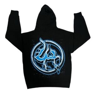 Black hoodie featuring a bold blue graphic design on the front and back.