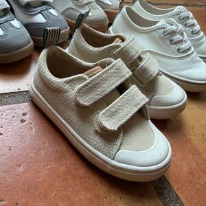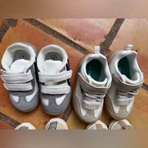 Barely worn, aside from the slightest signs of use these look brand new! Waited too long to wear and outgrew. All are size 5, except for the solid white shoes which are a 6 but in our experience fit smaller like a 5! Brands vary - Carters (green stripe), Old Navy (white and tan) and Cat and Jack (grey and black)!
