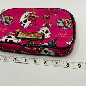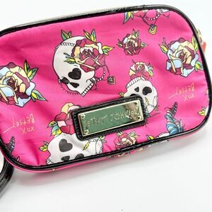 Betsey Johnson pink floral skulls weekender cosmetic travel bag and matching pou
