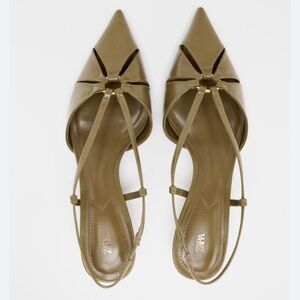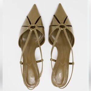Zara olive green slingback kitten heels with a sleek pointed toe and refined stitched detailing. Elegant silhouette with delicate straps and a comfortable low heel.