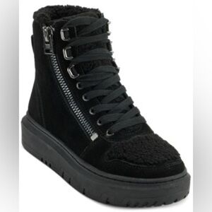 sherpa fleece, suede, water-repellent fabric, brand logo, plain colour, fabric inner, laces, zipper closure, round toeline, flat, rubber sole, contains non-textile parts of animal origin, high-top trainers 1-1/2" platform heel