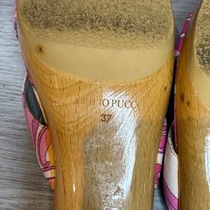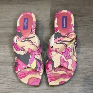 Bold Emilio Pucci sandals with pink and cream patterns. Perfect for a stylish look.