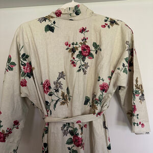 This handmade women’s robe features a lightweight linen-blend fabric in a cream base with a floral print in shades of pink, red, green, and brown. Designed with a wrap-style closure and a matching fabric tie belt, it offers an easy, adjustable fit. The robe has elbow-length sleeves and a mid-length hem.