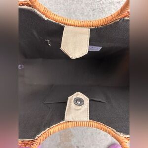 This stylish woven handbag features a sophisticated black and tan design, perfect for any occasion. The unique circular handle adds a touch of elegance. Ideal for women who appreciate both fashion and functionality.