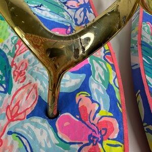Lilly Pulitzer Flip Flops Women 9/10 Gold Straps w/Pink & Blue