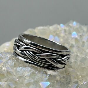 This stunning sterling silver spinner ring features an intricate braided (twist) design that catches the eye and adds a touch of vintage elegance to any outfit. The band fits for ultimate comfort, making it perfect for everyday wear or special occasions. Crafted from high‑quality .925 sterling silver, the ring’s smooth finish and dynamic spinning action give it a luxurious feel while showcasing your unique style. Ideal for layering with other jewelry or wearing solo as a statement piece, this spinner ring combines craftsmanship, versatility, and timeless charm—exactly what Poshmark shoppers look for in premium accessory jewelry. I Ship it fast so the buyer enjoys a gorgeous, authentic silver spinner that boosts their collection and everyday sparkle! Item 1206